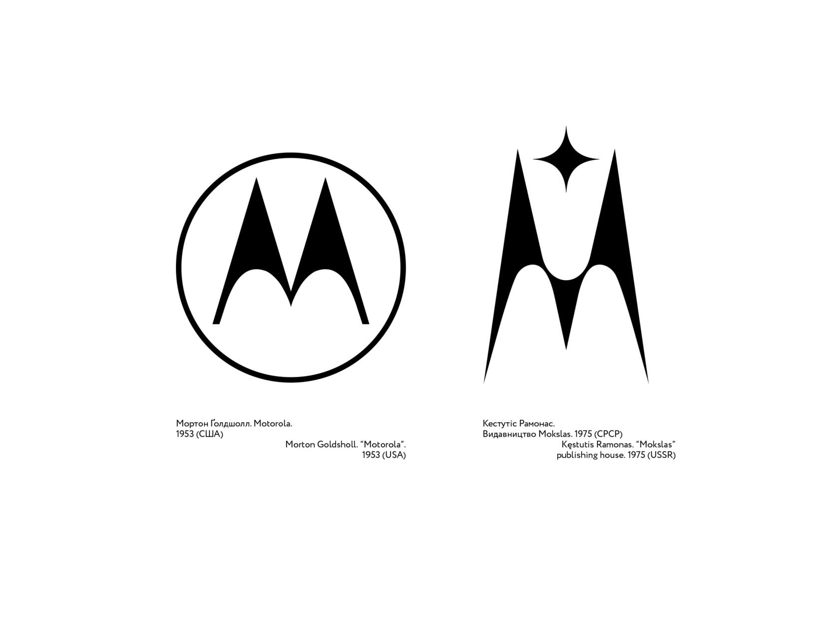 It is almost impossible to tell whether Soviet designers actually copied the works of their western colleagues. Since the modernist logo aesthetic was limited to a very small amount of visual solutions it is quite possible that Soviet designers came up with their designs independently. While there have been many stories about Soviets copying the advancements of capitalist technologies, in the case of logo design it is always worth analyzing the context in which the logo was actually designed. The graphic features of the mark designed for the publishing house “Mokslas” (Science) by Kęstutis Ramonas can be compared to a well-known mark of the US telecommunication company “Motorola” (auth. Morton Goldsholl). The letter “M” in both logos is constructed out of several elliptical arches and sharp line crossings. Both marks, in essence, reflect the futuristic aesthetics that is typical of their era. The dynamic of the “Motorola” (1952) mark somewhat reminds us of “streamline moderne”, which was widespread in the USA during the 1940s and 1950s, or the “raygun gothic” style, which was at the time widely used as a way to visualise the progress of society and its future. Meanwhile, the mark of “Mokslas” (1975) with the same graphic features reflects the technological progress of a yet another era – the beginning of Space Age which entered the Soviet Union in the 1960s and 1970s.