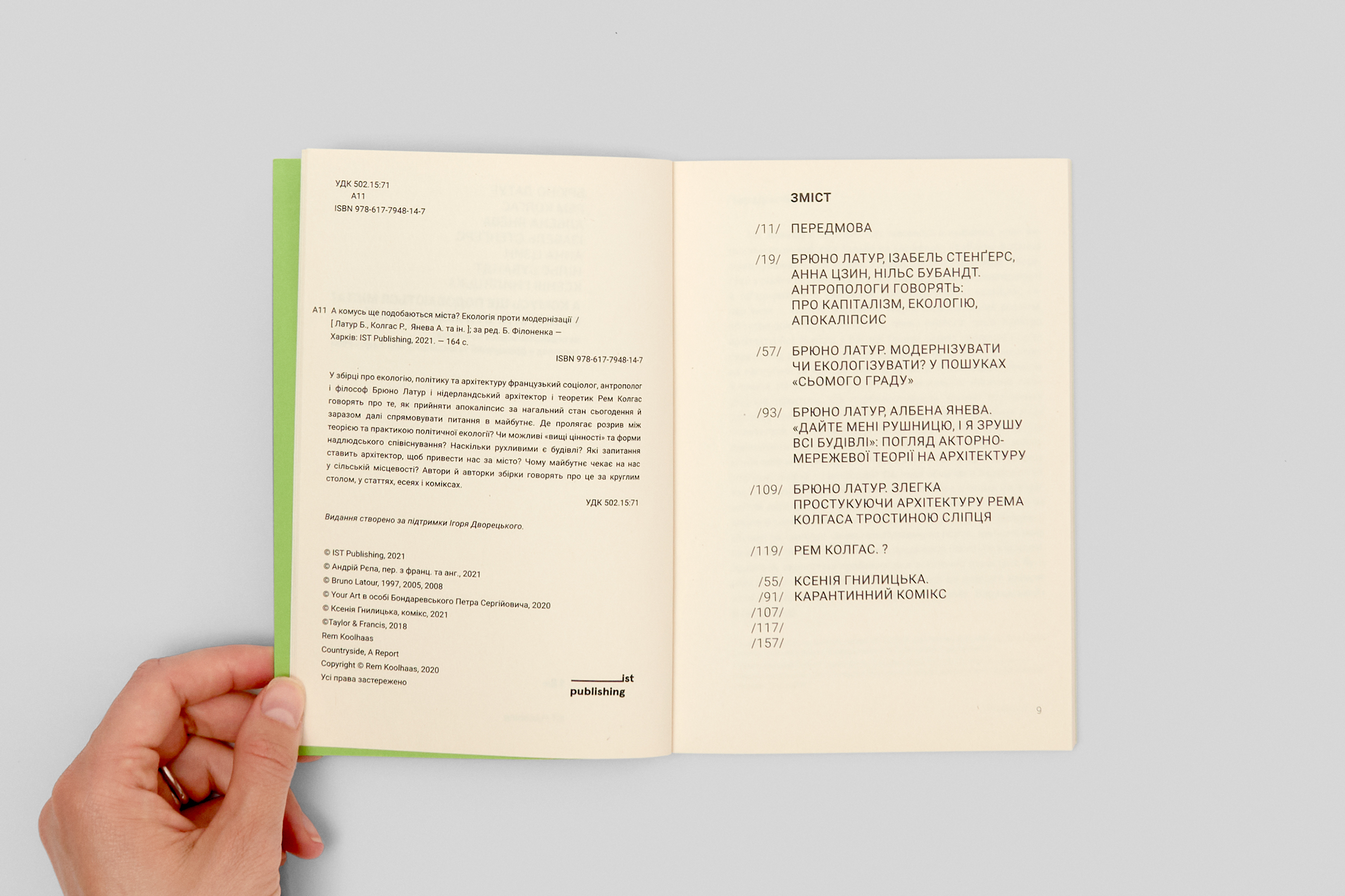 Упорядник збірки та головний редактор ist, Борис Філоненко розповідає, чому під сьомим номером книжка з серії Small Run Books виходить саме на таку тему: «Брюно Латур і Рем Колгас під однією обкладинкою. Думаю, тим, хто не зміг потрапити на їхні спільні дискусії та проєкти, буде цікаво прочитати ці тексти разом, після виставки Колгаса Countryside. The Future в Музеї Ґуґґенгайма та бієнале в Тайбеї You and I Don’t Live on the Same Planet, співкуратором якої був Латур. Для мене "А комусь ще подобаються міста? Екологія проти модернізації" — це передусім збірка з багатьма авторами та авторками, яка дає орієнтири та має потенціал продовжити спільне обговорення нагальних питань сьогодення. Хмарка тегів: екологія, руїни капіталізму, апокаліпсис, зелені партії, рухлива архітектура, пандемія, сільська місцевість замість міста.