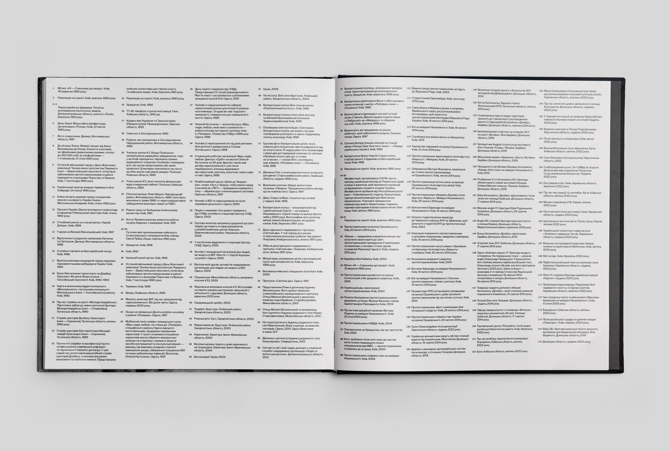 Хоча фотографічна практика Глядєлова охоплює різні країни та контексти — від Центральної Азії до Африки, — ця фотокнига зосереджена виключно на знімках, зроблених в Україні. Однак ідеться не про архів і не про послідовну оповідь. «Час не є академічним», — зауважує Глядєлов. Ця позиція визначає композицію видання: замість хронології — тематичні розділи, що окреслюють чотири ключові напрями його практики. 90-ті як явище трансформації та розпаду; Діти як погляд ізсередини уразливого становища; Протест як фаза суспільного самовизначення; Війна як довготривала тема, яку автор послідовно документує в Україні та за її межами.