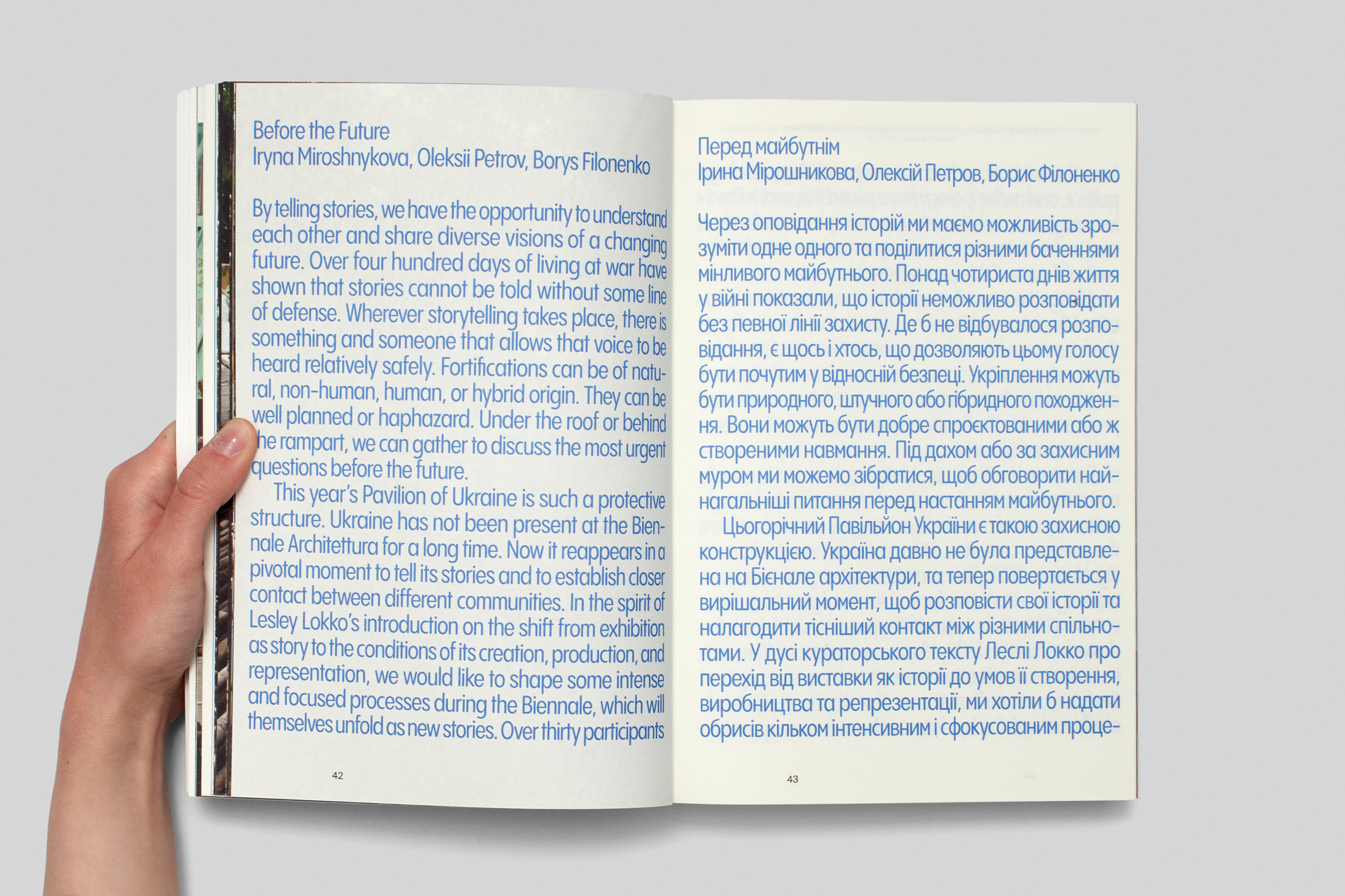 Before the Future / Перед майбутнім знаменує повернення Павільйону України на Бієнале архітектури 2023 після дев'ятирічної перерви. Однойменний каталог містить тексти та зображення від кураторів і колективів, а також додаткові статті та есеї, які розширюють дискусії, ініційовані в рамках проєкту.