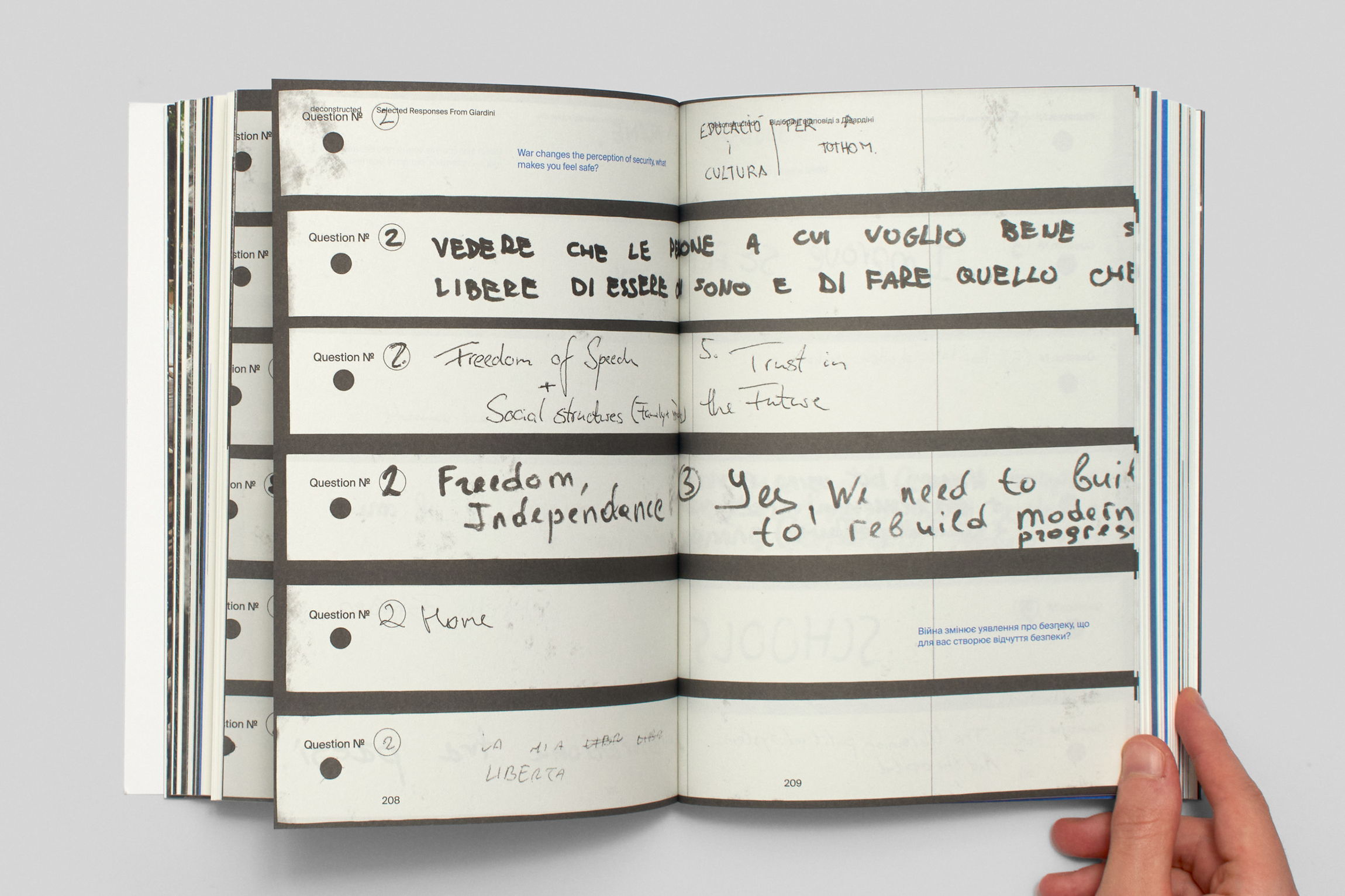 Вкриті травою земляні фортифікаційні споруди в Джардіні та темне, замкнуте укриття в Арсеналі стали просторами для взаємодії, де українські архітекторки і архітектори разом з практикинями і практиками з інших галузей представляють спільні висловлювання про те, як розповідати історії під час війни, про цінність колективних дій перед обличчям загрози, про різноманітні теми, які об'єднують архітекторок/ів в Україні сьогодні, про запитання, які необхідно ставити сьогодні, перед майбутнім.