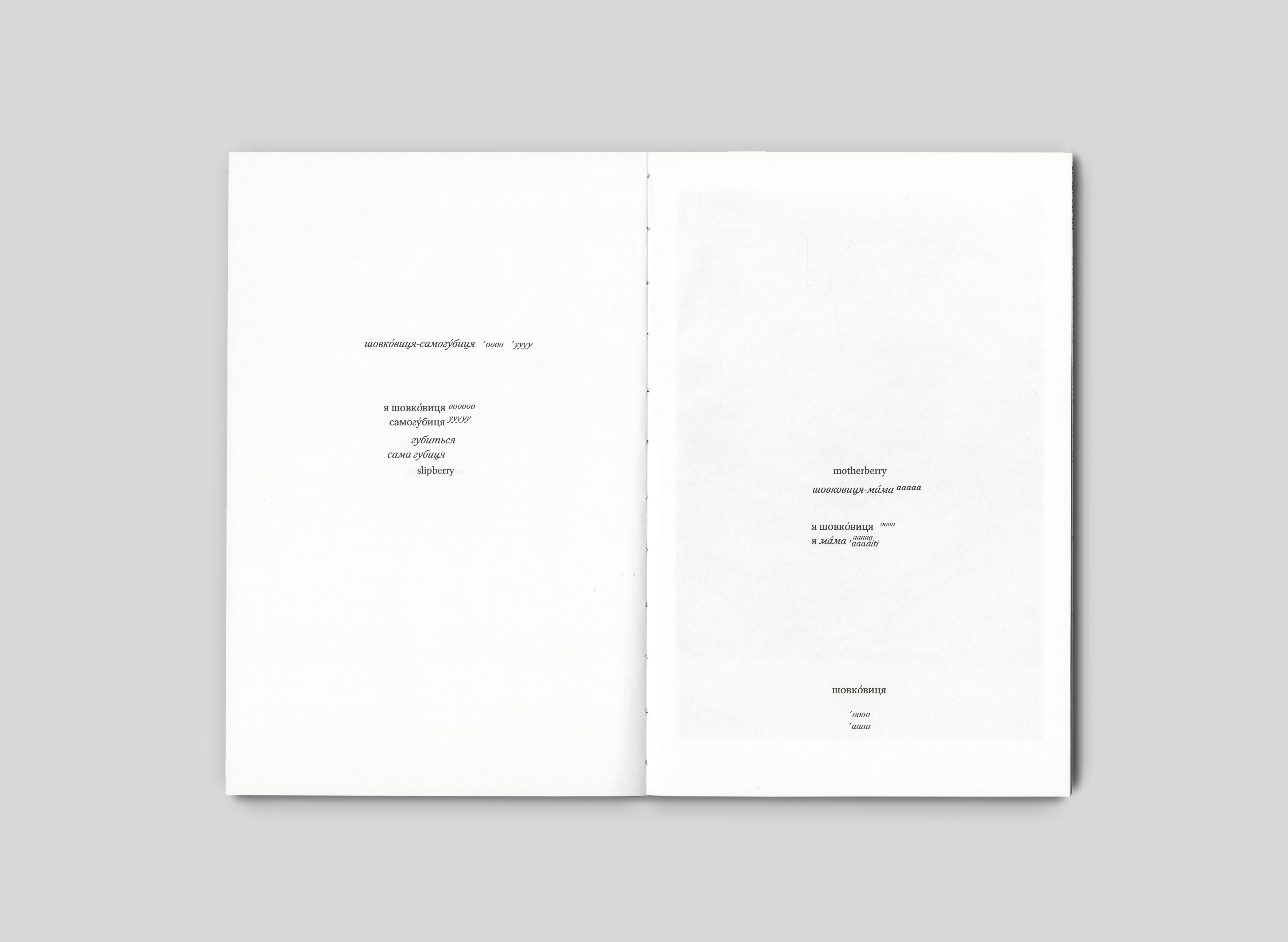 Артбук художниці Каті Лесів базується на чуттєвому досвіді, дослідженні міфу та тілесності жіночого. Тіло постає як рухомий об’єкт пам’яті, повертається до відчуття безпеки та насолоди, що увібрані у ритуал споживання ягід шовковиці з дерева в дитинстві. На тлі непередбачуваності та крихкості світу художниця фіксує чуттєвий досвід як м’яку, але стійку маніфестацію наміру до життя і повернення.