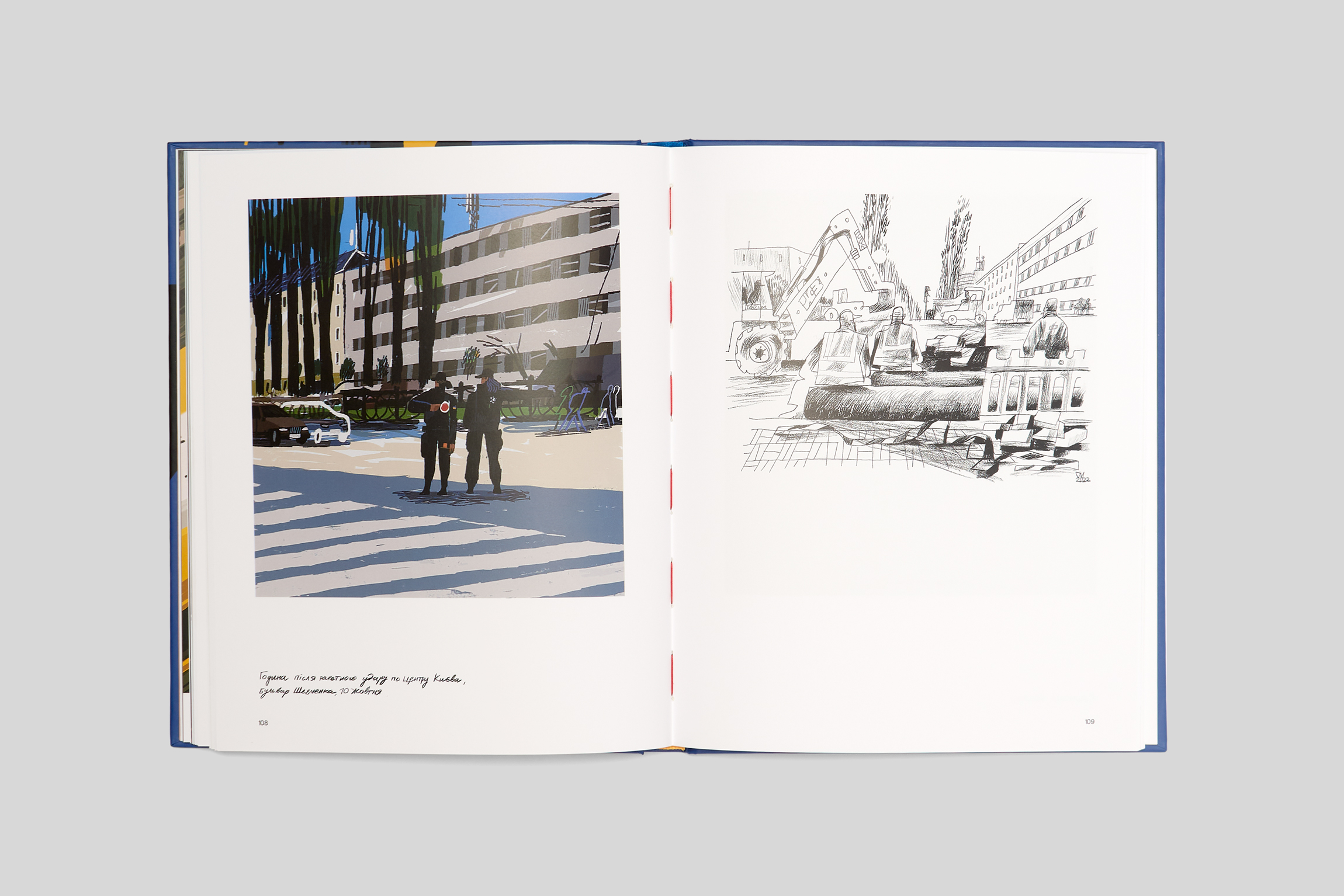 У більш ніж 50 ілюстраціях Сергій Майдуков відтворює події півтора року повномасштабної війни, працюючи з різними медіумами: олівцем, чорнилом, папером, планшетом. В основу візуального видання лягли зображення авторської щотижневої колонки Сергія Майдукова для німецького видання Zeit Magazin. Також артбук доповнено чорно-білими скетчами та замальовками, що розширюють оповідь. Так малюнки, які працюють з приватною рефлексією, перетворюються на сторінки широкомасштабної війни: перші удари по Києву, оборона Бахмута, щоденні обстріли країни весною 2023-го та зміни, які відбуваються в містах і людях.